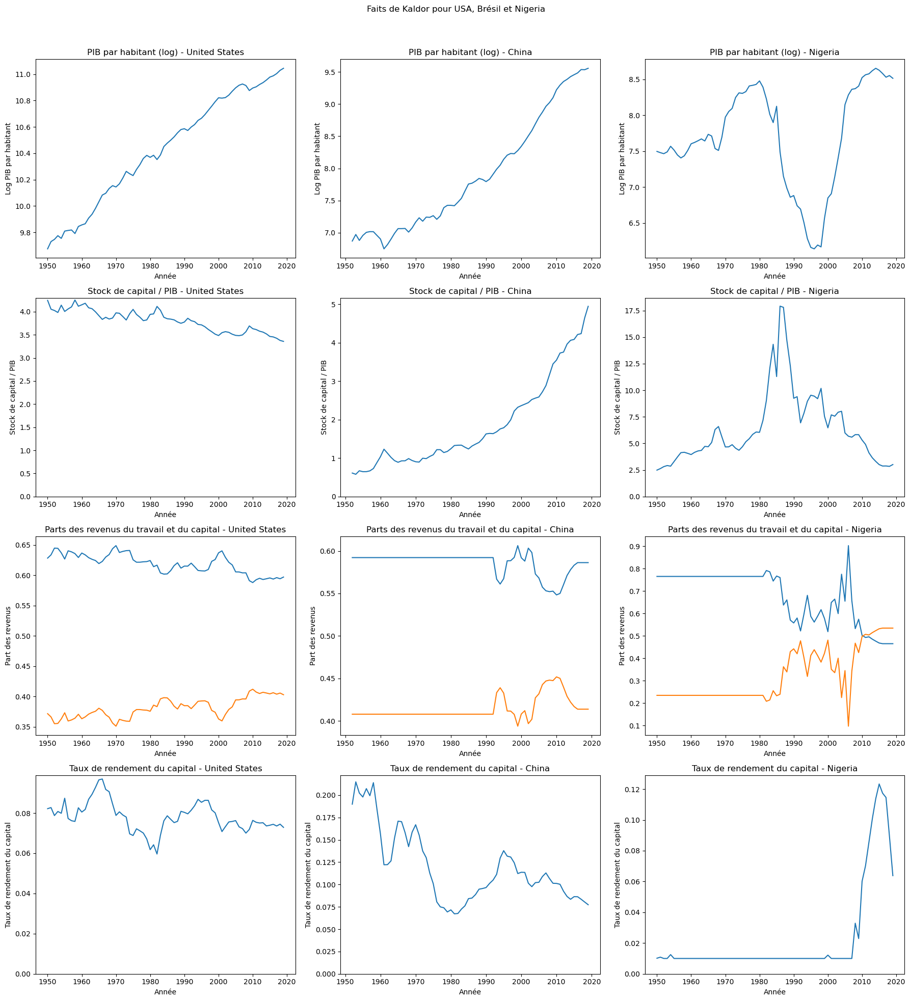# Télécharger les données de la Penn World Tabledata = pd.read_excel('data/TD2_pwt1001.xlsx', sheet_name='Data')# Sélectionner les pays (un pays riche, un pays à revenu intermédiaire et un pays pauvre)pays = ['United States', 'China', 'Nigeria']# Initialiser les figuresfig, axs = plt.subplots(4, 3, figsize=(18, 20))fig.suptitle('Faits de Kaldor pour USA, Brésil et Nigeria')for i, pays inenumerate(pays): donnees_pays = data[data['country'] == pays]# Taux de croissance du PIB/hab 🛠️ donnees_pays['croissance_pib_par_hab'] = donnees_pays['rgdpo'].div(donnees_pays["pop"])# Ratio du stock de capital total au PIB 🛠️ donnees_pays['ratio_capital_pib'] = donnees_pays['cn'].div(donnees_pays['cgdpo'])# Parts des revenus du travail et du capital dans le PIB 🛠️ donnees_pays['part_revenu_travail'] = donnees_pays['labsh'] donnees_pays['part_revenu_capital'] =1- donnees_pays['labsh']# Taux de rendement du capital 🛠️ donnees_pays['rendement_capital'] = donnees_pays['irr']# Graphiques# 1. PIB par habitant à l'année de base en échelle logarithmique en fonction de l'année axs[0, i].plot(donnees_pays['year'], np.log(donnees_pays['croissance_pib_par_hab'])) axs[0, i].set_title(f'PIB par habitant (log) - {pays}') axs[0, i].set_xlabel('Année') axs[0, i].set_ylabel('Log PIB par habitant')# 2. Stock de capital / PIB en fonction du temps axs[1, i].plot(donnees_pays['year'], donnees_pays['ratio_capital_pib']) axs[1, i].set_title(f'Stock de capital / PIB - {pays}') axs[1, i].set_xlabel('Année') axs[1, i].set_ylabel('Stock de capital / PIB') axs[1, i].set_ylim(bottom=0)# 3. La part du travail dans le PIB axs[2, i].plot(donnees_pays['year'], donnees_pays['part_revenu_travail'], label='Part des revenus du travail') axs[2, i].plot(donnees_pays['year'], donnees_pays['part_revenu_capital'], label='Part des revenus du capital') axs[2, i].set_title(f'Parts des revenus du travail et du capital - {pays}') axs[2, i].set_xlabel('Année') axs[2, i].set_ylabel('Part des revenus')# 4. Taux de rendement du capital en fonction de l'année axs[3, i].plot(donnees_pays['year'], donnees_pays['rendement_capital']) axs[3, i].set_title(f'Taux de rendement du capital - {pays}') axs[3, i].set_xlabel('Année') axs[3, i].set_ylabel('Taux de rendement du capital') axs[3, i].set_ylim(bottom=0)plt.tight_layout(rect=[0, 0, 1, 0.96])plt.show()